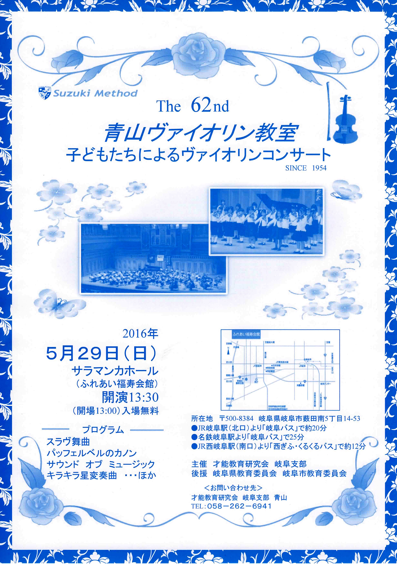第62回 青山ヴァイオリン教室 子どもたちによるヴァイオリンコンサート 2016年5月16日イベントnobu 日時:2016年5月29日(日曜日) 場所:サラマンカホール(ふれあい福寿会館) 開演13:30(開場13:00) 入場無料 《お問い合わせ先》 才能教育研究会 岐阜支部 青山 TEL: 058-262-6941