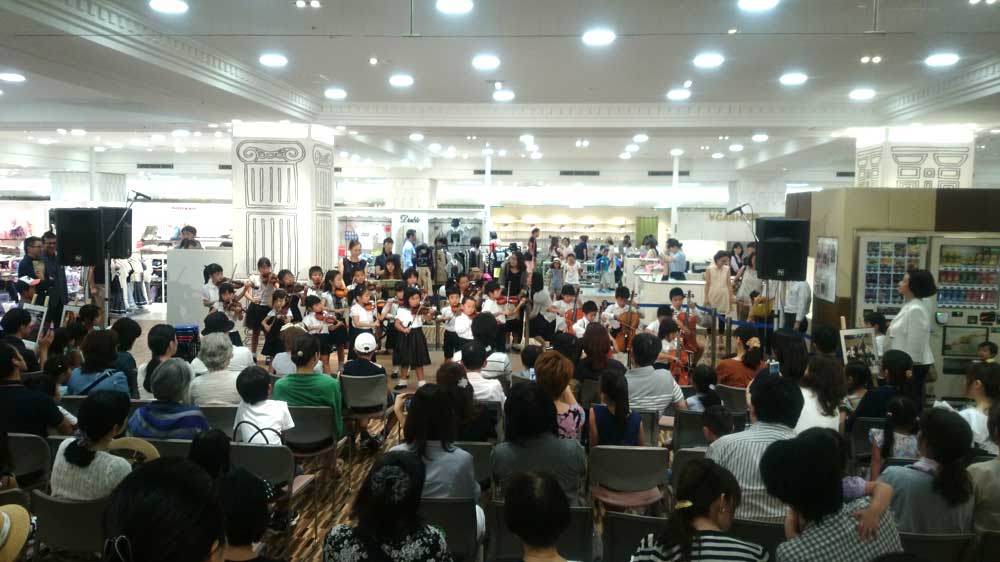 今年からの初めての祝日「山の日」の8月11日(木)に、ジェイアール名古屋タカシマヤ8階ローズパティオにて「おこさま音楽演奏会」を開催しました。小学生以下のスズキ・メソードの子供たちによるミニコンサートで、11時・1時・3時の3回公演でした。