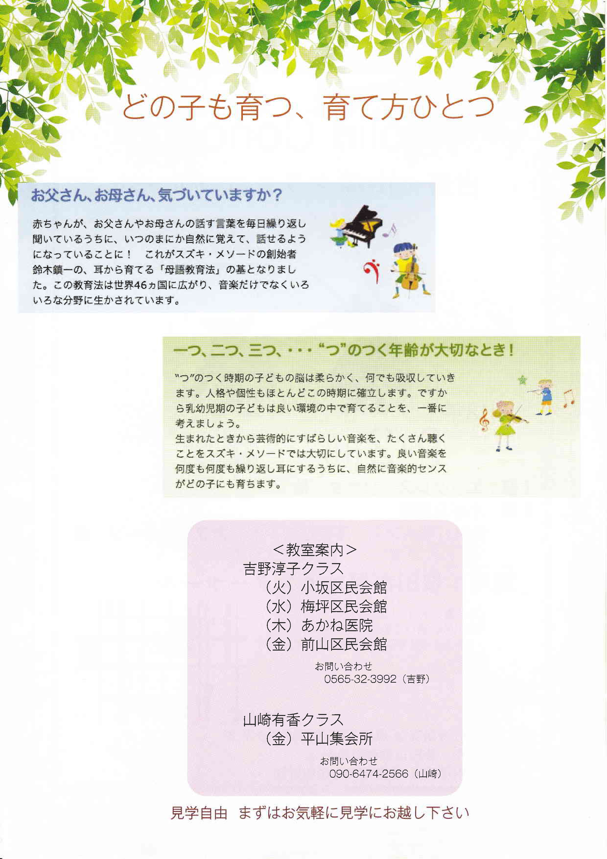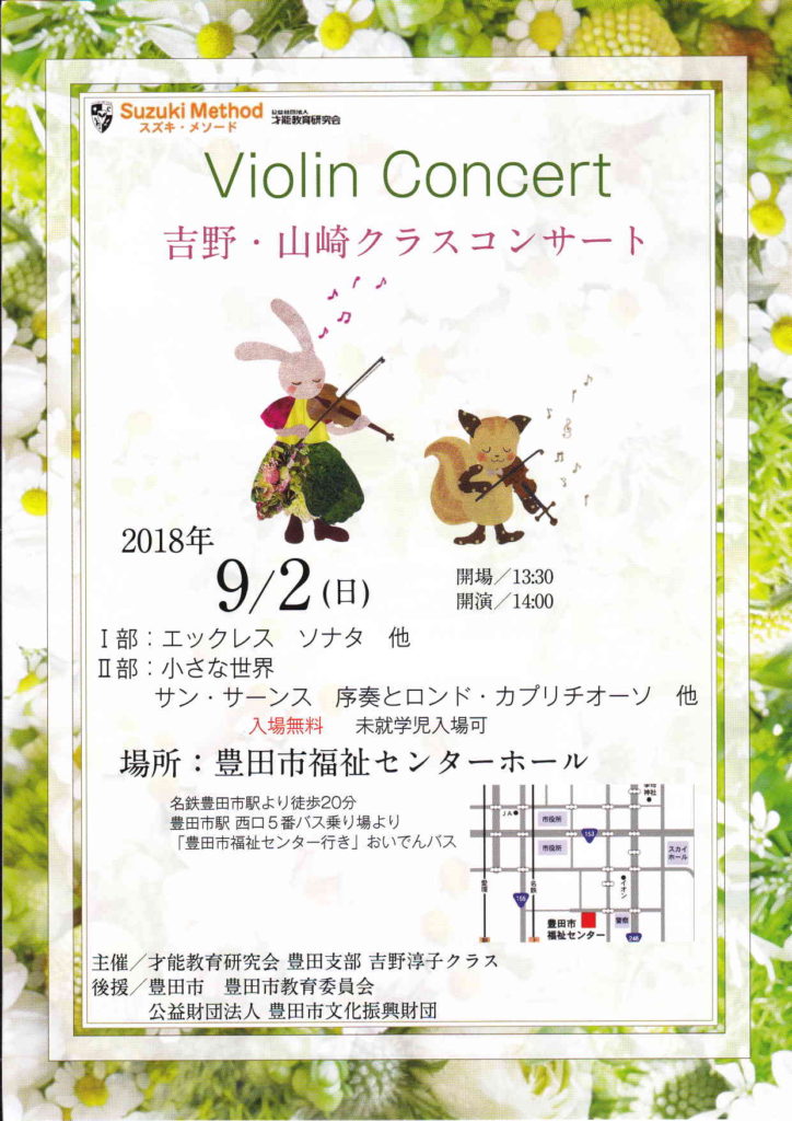 吉野・山崎クラス ヴァイオリンコンサート 2018年7月31日イベントnobu 吉野・山崎クラス ヴァイオリンコンサート 日時:2018年9月2日 吉野淳子クラス、山崎有香クラスの子ども達による合同コンサートを開催します。入場無料ですので、どなたさまもお気軽にお越しください。 開場:13:30 開演:14:00 場所:豊田市福祉センター ホール 入場無料