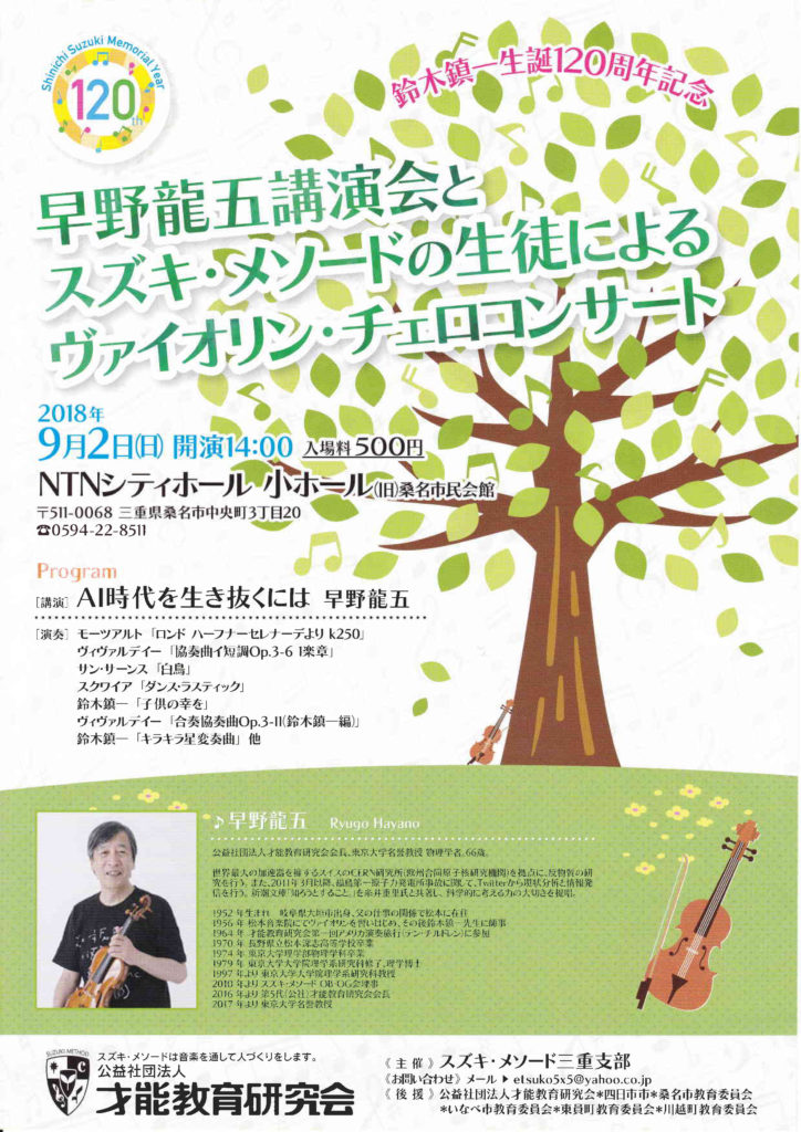 早野龍五講演会とスズキ・メソードの生徒達によるヴァイオリン・チェロコンサート 2018年7月31日イベントnobu 早野龍五講演会とスズキ・メソードの生徒達によるヴァイオリン・チェロコンサート スズキ・メソードの会長であり、物理学者でもある早野龍五による講演と、生徒達によるコンサートを開催します。 開催日:2018年9月2日 開演:14:00 会場:NTNシティホール 小ホール(旧桑名市民会館) 入場料:500円