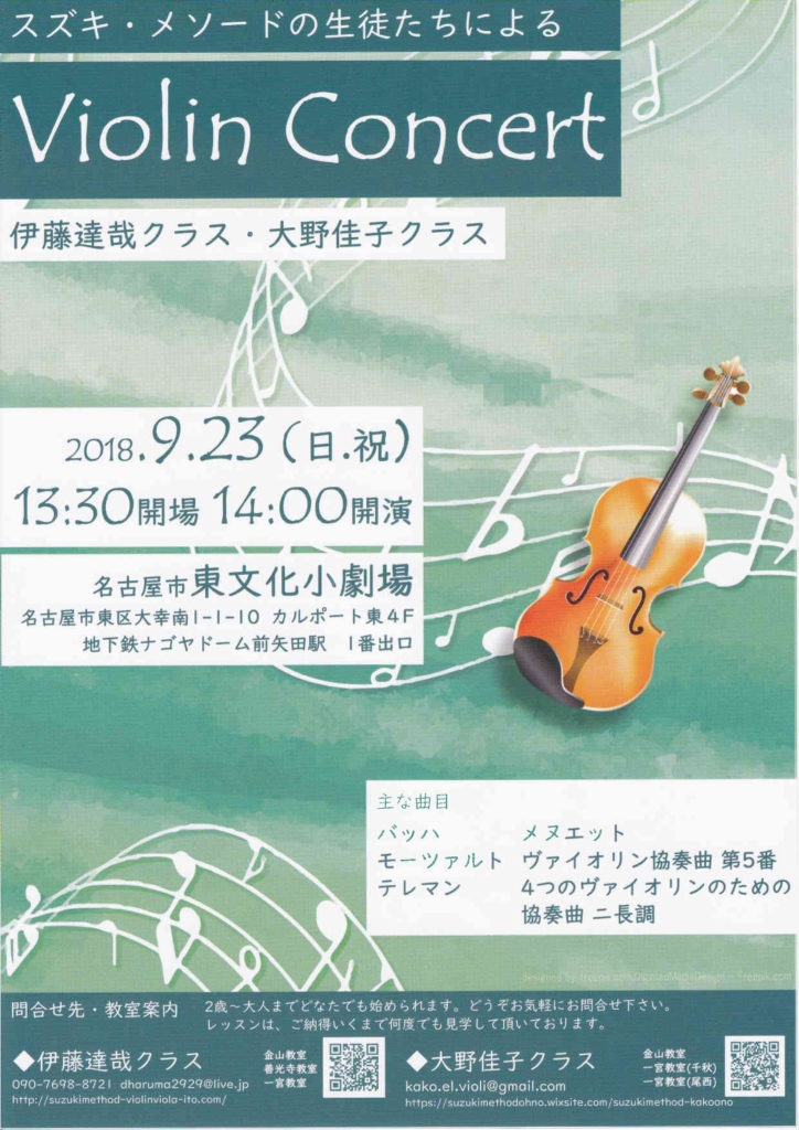【伊藤達哉クラス・大野佳子クラス】 スズキ・メソードの生徒たちによるヴァイオリンコンサート 2018年8月14日イベントnobu スズキ・メソードの生徒たちによるヴァイオリンコンサート 【伊藤達哉クラス・大野佳子クラス】 2018年9月23日 13:30会場 14:00開演 名古屋市東文化小劇場