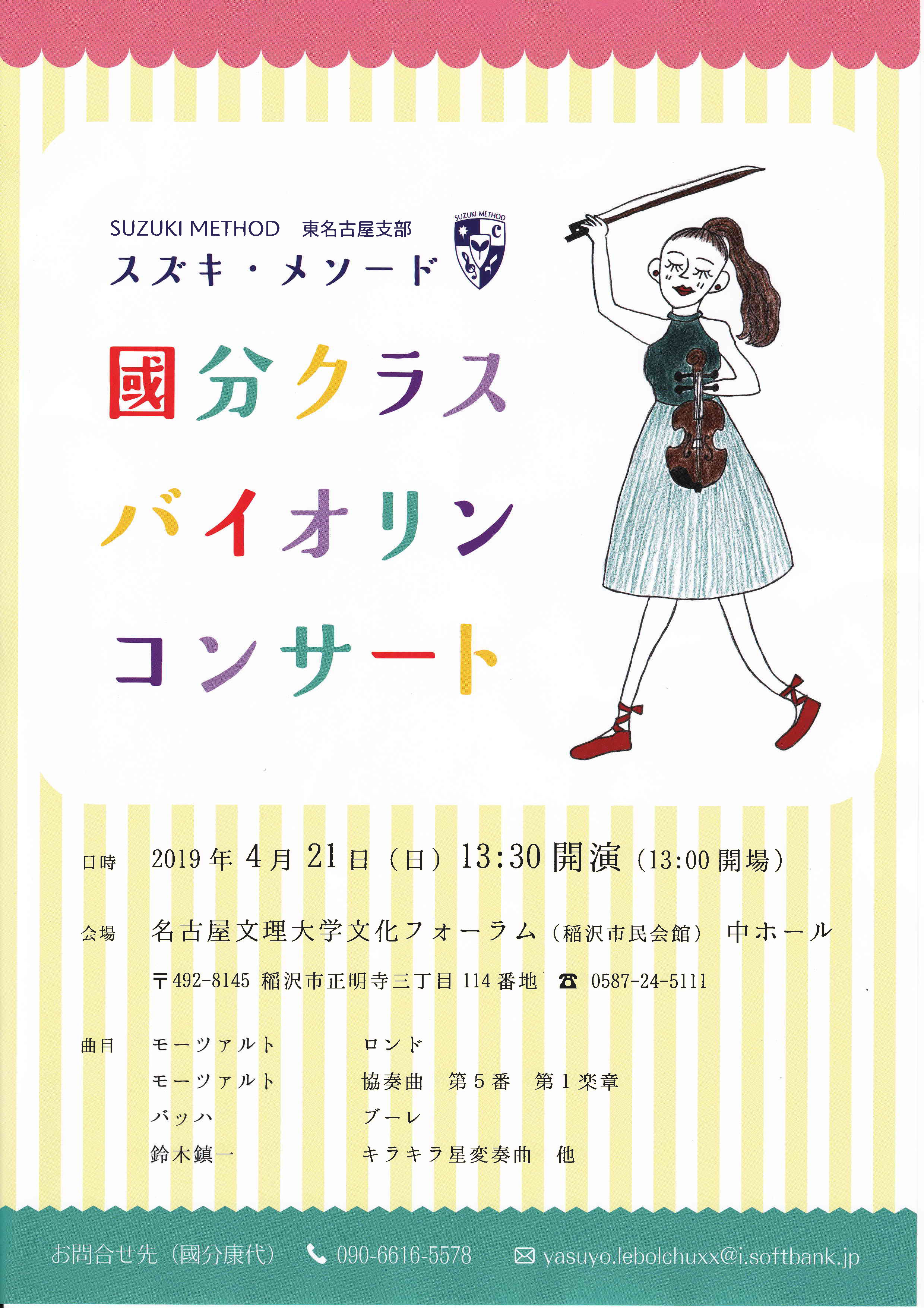 國分クラス バイオリンコンサート 2019年3月18日イベントnobu スズキ・メソード 東名古屋支部 國分クラス バイオリンコンサート 2019年4月21日(日)13:30開演 (13:00開場) 開場:名古屋文理大学文化フォーラム(稲沢市民会館)中ホール