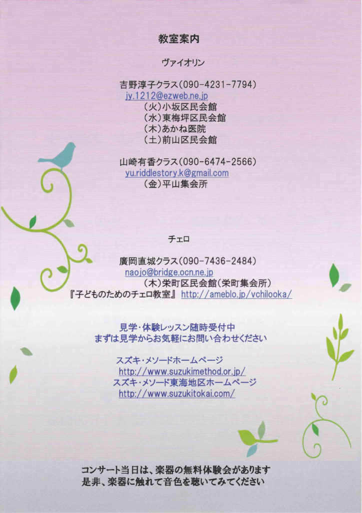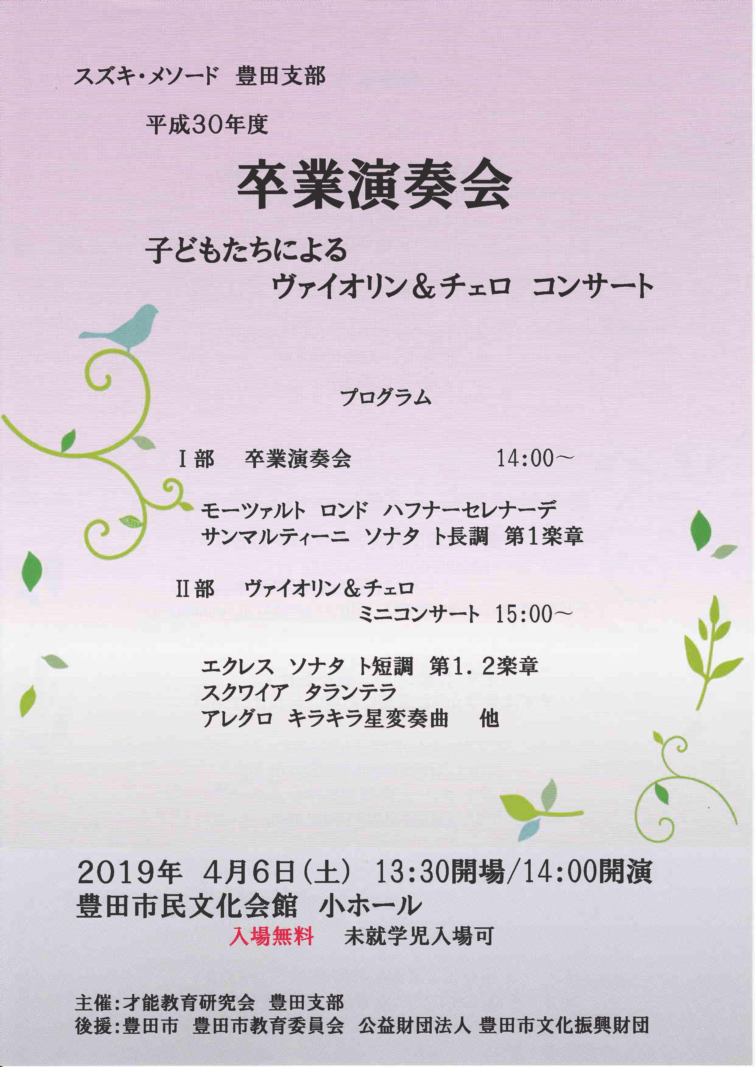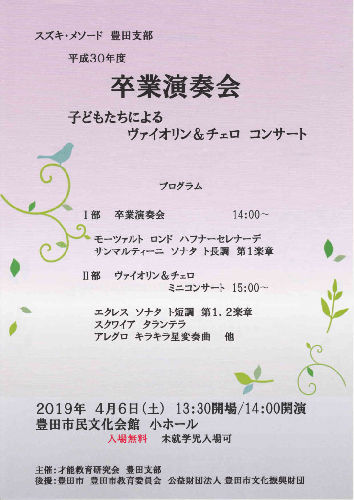 スズキ・メソード豊田支部 平成30年度卒業演奏会 2019年3月26日イベントnobu スズキ・メソード豊田支部 平成30年度卒業演奏会 子どもたちによるヴァイオリン&チェロコンサート 2019年4月6日(土)13:30開場/14:00開演 豊田市民文化会館 小ホール 入場無料 未就学児入場可