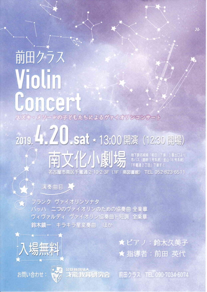 前田クラス スズキ・メソードの子どもたちによるヴァイオリンコンサート 2019年3月26日イベントnobu 前田クラス スズキ・メソードの子どもたちによるヴァイオリンコンサート 4月20日 13:00開演 入場無料 会場:南文化小劇場