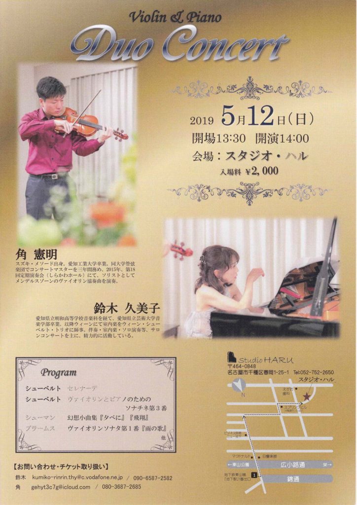 角憲明 鈴木久美子 ヴァイオリン&ピアノデュオ コンサート 2019年3月26日イベントnobu 2019年5月12日 開場13:30 開演14:00 会場:スタジオ・ハル 入場料:¥2,000 お問い合わせはチラシに記載の連絡先まで