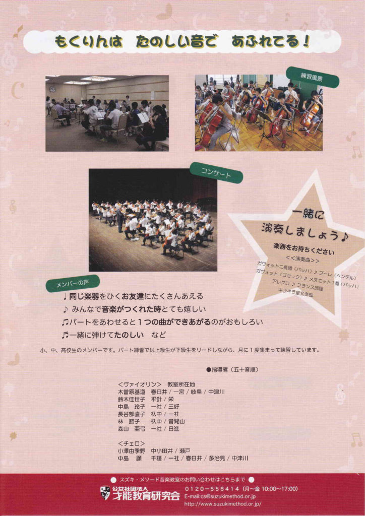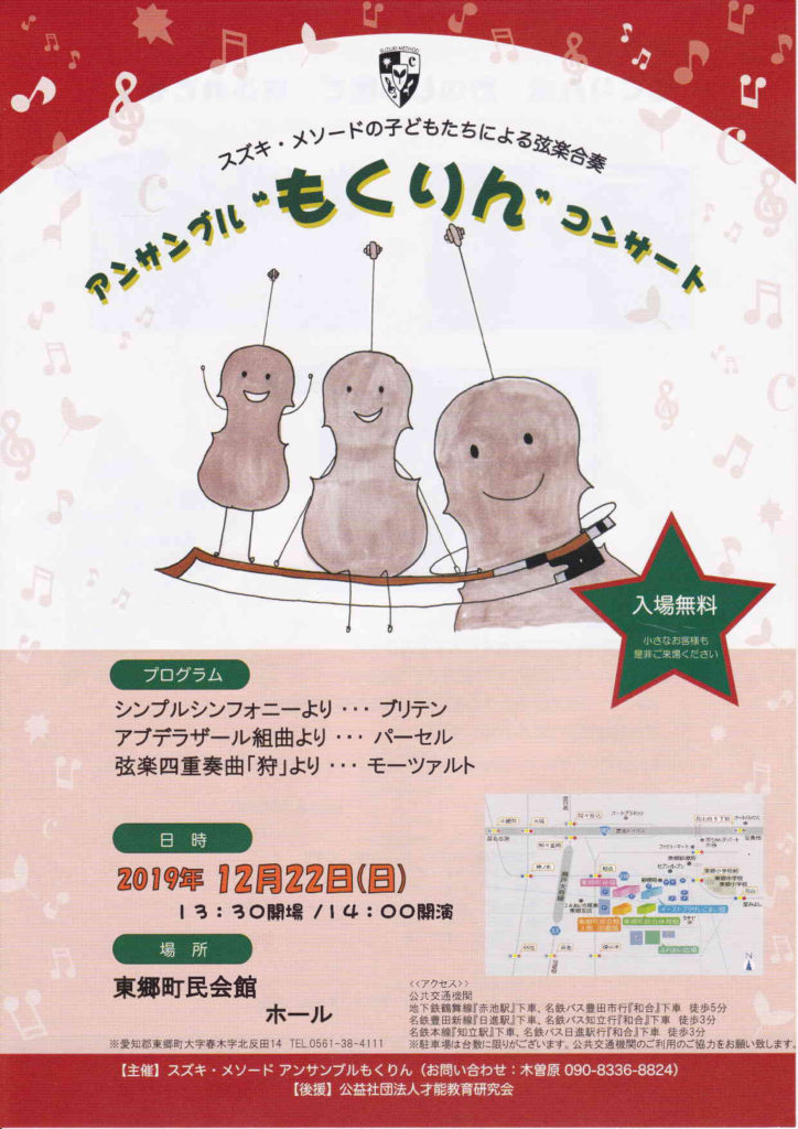 アンサンブル”もくりん”コンサート 2019年10月29日イベントnobu スズキ・メソードの子どもたちによる弦楽合奏アンサンブル”もくりん”コンサート 日時:2019年12月22日会場:東郷町民会館ホール入場無料