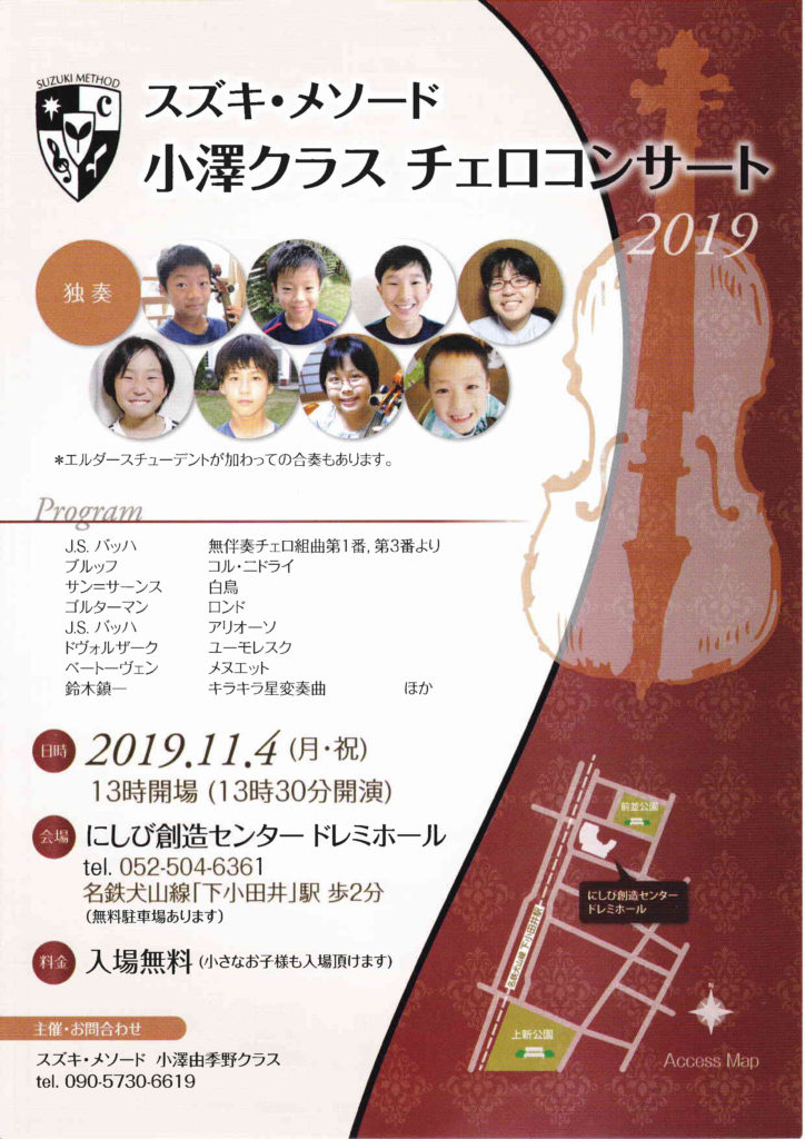スズキ・メソード 小澤クラスチェロコンサート 2019 2019年10月29日イベントnobu 小澤クラスチェロコンサート2109 2019年11月4日(月・祝)13時開場 会場:にしび創造センタードレミホール 入場無料